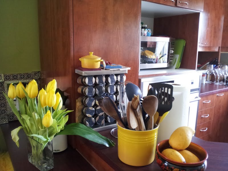 To spite the weather, here's a cheery, spring-y photo of some yellow in the kitchen, including some beautiful tulips Z. gave me at my launch, which lasted and lasted.