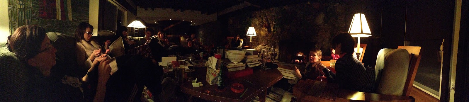 It was luxurious to knit in a room that held all of us comfortably (but still cozily)! Often we have to coordinate to bring chairs over to each other's apartments on knit night. The resident speed-knitters K and J finished projects. (Actually, I think a couple of other people may have as well.) My hat grew an inch, but that’s about all I can say for it. Though I've now added at least three more things I want to make to my what-to-knit-next-list. There were also Tarot card readings and a fun game of Celebrity.