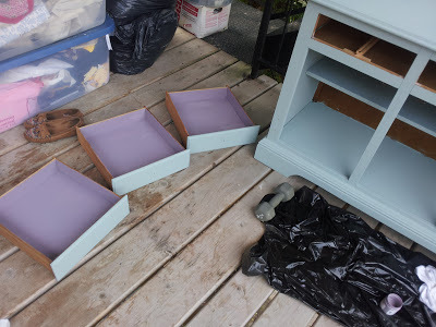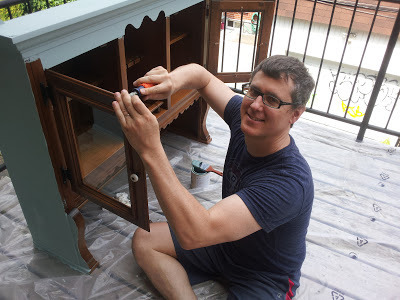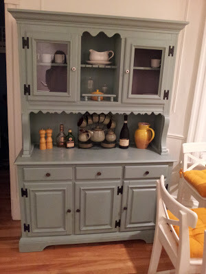 Then on to something bigger...We started the hutch last weekend and finished it up last night. The weather (perpetual intermittent rain) has made things difficult! My husband did more of the painting, but we both did the waxing and the buffing.