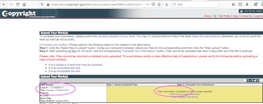 Despite this day’s track record, I decided to boldly proceed to apply for copyright of my new novel. This is a tedious process laced with notices and exclamation marks and warnings. And once something is entered into the online form, it can never ever be altered apparently. The copyright office’s online registration interface looks like a cheap knock-off of Windows XP, and though there may be those in our midst who remember it fondly, I, Dear Reader is not one of them. Moreover, it is slow, excruciatingly slow.