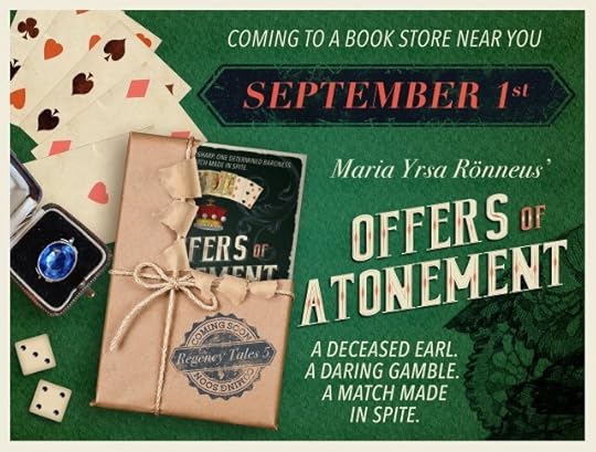 I am proud to announce that Offers of Atonement will be released on September 1st. It’s the fifth stand-alone novel in my Regency Tales series and you’ll meet both new characters and reconnect with some old friends. Captain James Hartcourt is a cardsharp who has to juggle an unusal request from a friend, a scheming mother, crushing anxiety, and a woman who turns everything topsy-turvy.