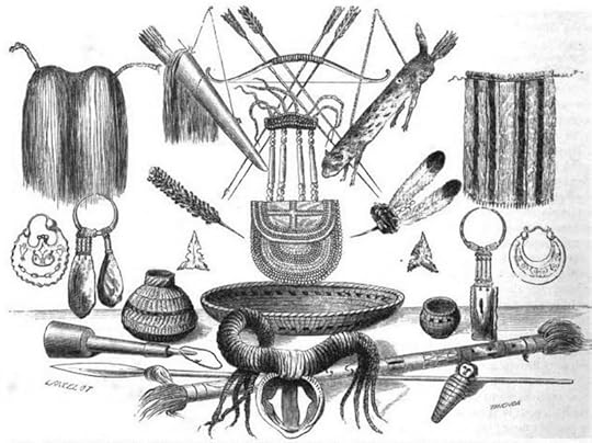 Weapons, ornaments, utensils of Mohave, Yampai and Chimehwhuebe Indians, Le Tour du Monde, volume 1, 1860. [Note: it’s hard to tell what’s what in this drawing, but the cup/rattle on a string in the lower left could be a musical instrument, or a toy.]Mountain Spirit dancers in New Mexico perform at night. But Western Apache Mountain Spirit dancers (from Arizona) can perform during the day. A UCSB article has photographs of both ceremonies.