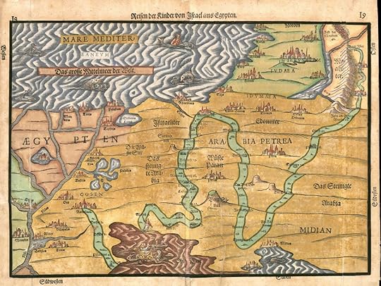 A map of Exodus, The National Library of Israel Collections, Map of the Exodus of the Israelites from Egypt, 1585, Heinrich Bunting.The Campsites (Stations) of the Exodus