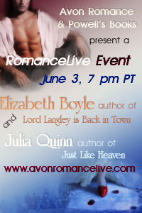 Friday, June 3rd: Romance Live! Powell's Books, Beaverton, Or and LIVE! via the internet. So this open to everyone. I mean, everyone. Like from the North Pole to the South Pole and all points between. Which if I start thinking about that too much, I may just pass out in the middle of it. So if you would like to see Julia Quinn have to call 911 as I suffer a full on panic attack, tune in. But truly, you can tune in, ask us questions, and even order a signed book personalized just for you.