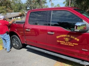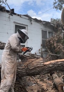 For once, I took my own advice. The person I would try to encourage today and, as it turns out, be encouraged by, was Stephanie Peterson of Valdosta’s Blossom Bee Removal. This amazing elementary school Ag teacher, mother, and bee expert agreed to extract a beehive from the hollow of a downed tree that our team had pulled from a roof at Georgia Christian School. Her willingness to help came with a caveat: “I’ll need someone to cut open the tree with a chainsaw… but I have an extra XL bee suit.” Yikes!