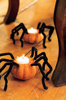 Look at these cute little guys. A few small pumpkins, some pipe cleaners and a votive candle or two and you're in business. I'm not sure I'd put them on the floor, especially with pets or small children around, but they'd also be great either clustered in small groups or alone as centerpieces.