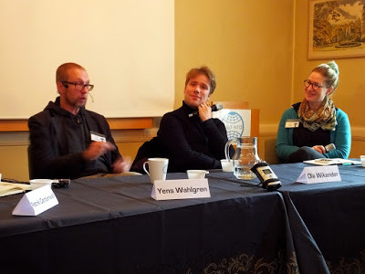 Apropå sådant var jag förra helgen med på fantastik/SF-konventet LunCon i Lund och panelpratade om språk i fantastisk litteratur - hemsnickrade språk, antika språks roll i sådan litteratur och annat - med författarkollegerna Nene Ormes och Yens Wahlgren, med tillika författarkollegan Patrik Centerwall som moderator. Här ser vi några bilder från evenemanget, tagna av Camilla Svedén. Jag kan inte låta bli att le åt mina ytterligt olika miner på de två bilderna:
