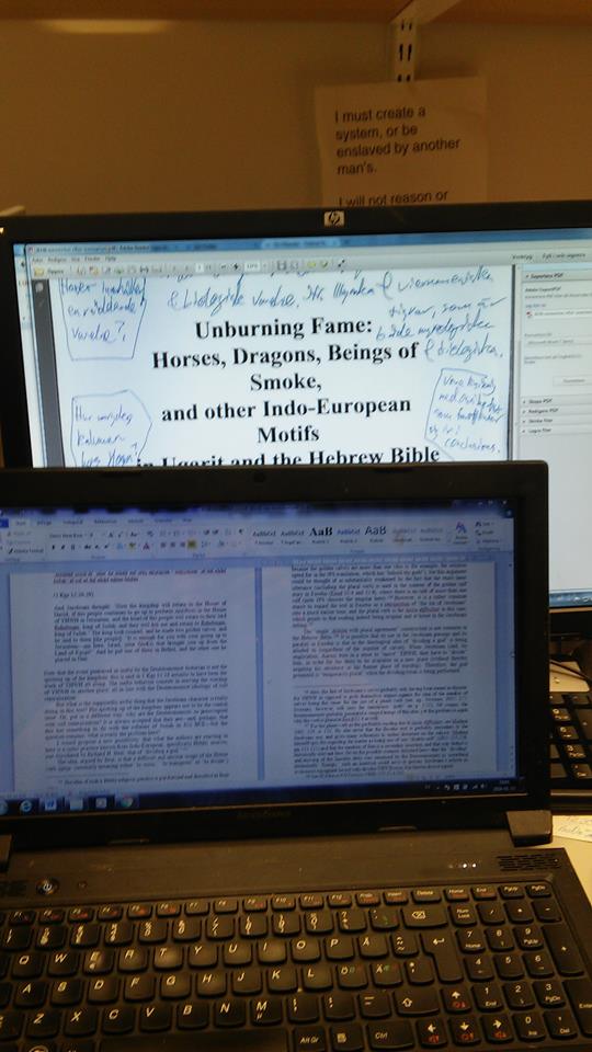 Boken som är under produktion närmar sig sin fulländan - exakt hur nära färdigställandet den är vågar jag inte sia om, men det tickar på. I boken utlovas drakormar, västsemitiska och filisteiska gudar, rökväsen, gränsöverskridare, hästar, hebreiska, vediska, hetttitiska, ugaritiska, avestiska och mycket annat - t.ex. diskussioner av den så kallade "Pizza-effekten", ett uttryck myntat av Agehānanda Bhāratī för att beteckna det kulturella fenomen som uppstår när ett fenomen "återimporteras" till den plats varifrån det ursprungligen kom - exemplet är naturligtvis pizzans väg från Italien till USA och sedan tillbaka igen.