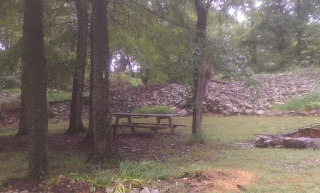 Almost ten years after my father died, my mother remarried and sold the house I grew up in. She didn't want the picnic table at her new house, and so I grabbed a couple of the cousins and absconded with it one Saturday afternoon. After the fire ring was put together, the table got moved to its permanent location. It's a quiet, shady spot to sit and think. I like to take my laptop to the table and do story planning for the next little while.