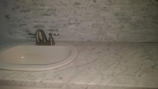 The backsplash was the big splurge. We chose a peel-and-stick tile of natural stone. The counter was straight off the rack as was the faucet. The sink is the same one I had. It's in great shape and a nice size. The vanity got a fresh coat of paint with some country details. Same for the medicine cabinets. The shower enclosure and the toilet weren't replaced. They, too, are in great shape. A new light fixture was in order simply because I'd grown tired of the old one. We've actually slated the old light to be installed in our shed to light a dark corner. Why not?