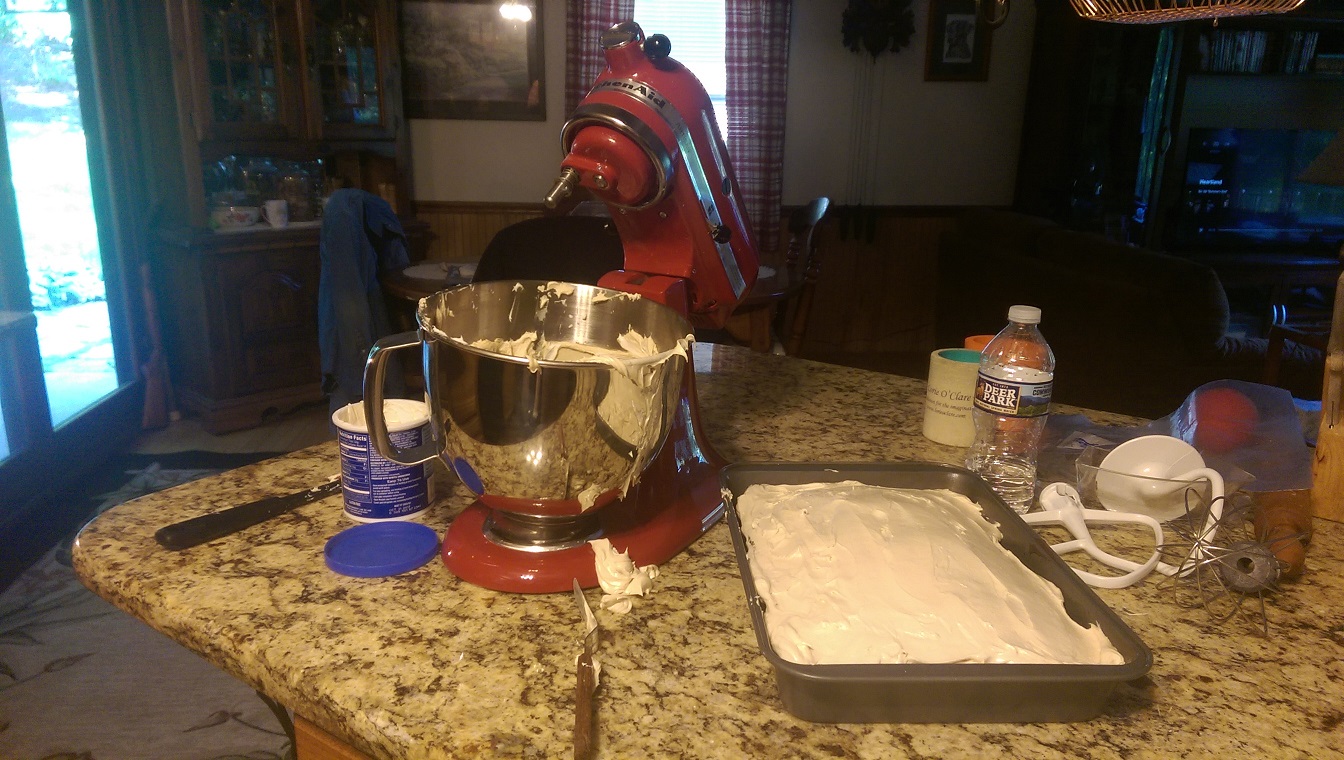 The spousal unit baked me a birthday cake which turned out very well. He can open a box and add eggs and water with the best of them. The trouble happened when he added peanut butter to a can of buttercream frosting. The end result was well worth the cleanup.  I may even have cake for breakfast today.