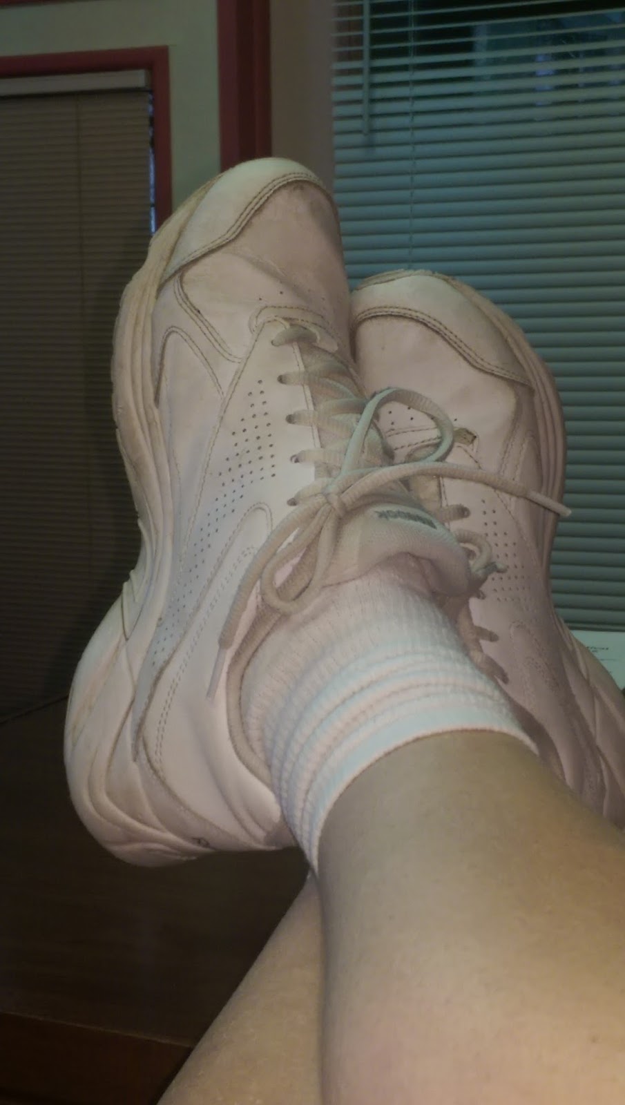 Shorts, an okay button shirt, and Reeboks. Maybe a bit..... I don't know.... too far. It's not my usual office attire.