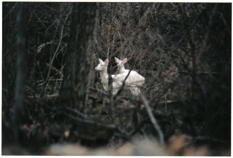 The three of us sat there in silence watching her for the longest time. She was worried about us, stomping her hooves and shaking her head and tail, but her baby refused to get up and run away and she refused to abandon it. Finally we decided to start the engine and leave her to the night. That did it. The fawn jumped up and ran into the darkness and mama followed. That was the only time my grandfather got to see the ghost deer. I was more fortunate as my picture attests. The ghost deer took up residence in the woods behind my house and frequently grazed in my back yard. There were four ghost deer living one year. I believe they were all doe because I never saw a rack on any of them. We know the last white fawn died young. Pop was out walking one day and found its body near the creek.