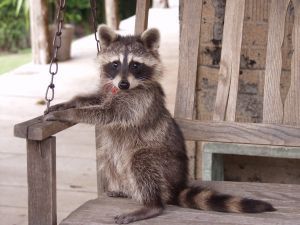 And no, thank God, that's not my porch swing. My personal experiences with coons have not been so charming. Well, accept for the one that hid behind the big oak tree and kept peeking around it to keep an eye on me. I surprised that one by walking out of the house at dawn. Usually these critters are bedded down for the day by then. I can only assume it was on its way home since healthy animals are very nocturnal. I'm pretty sure this guy was fine since he was thinking clearly enough to hide until I went inside then run like hell for the other side of the stone fence.