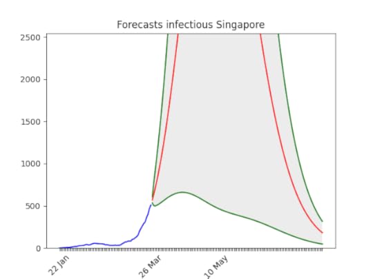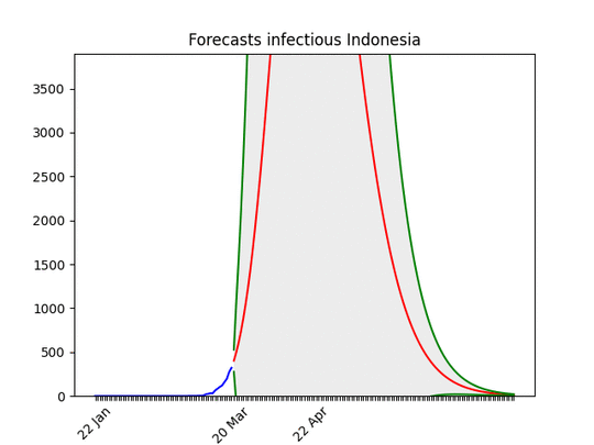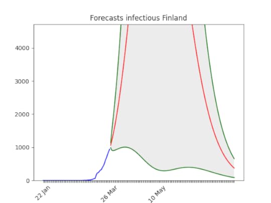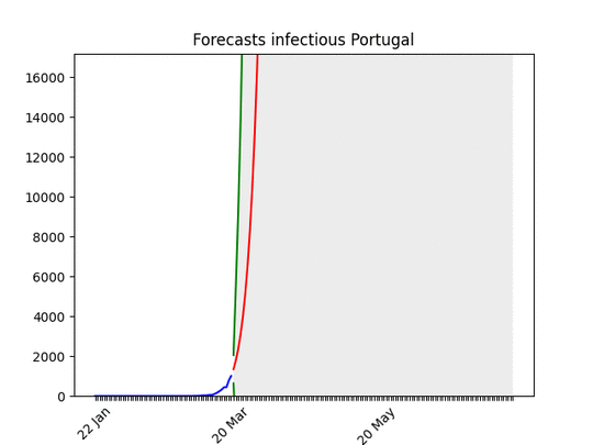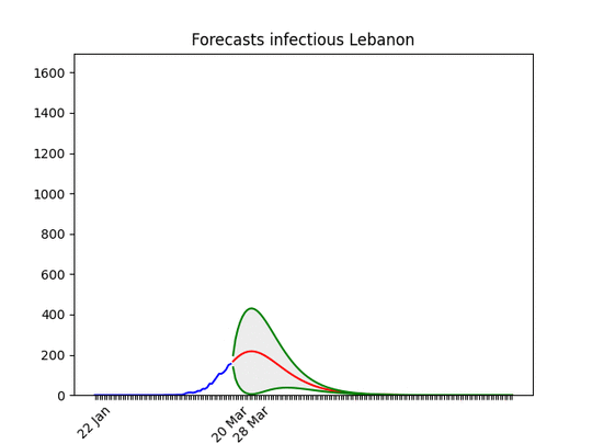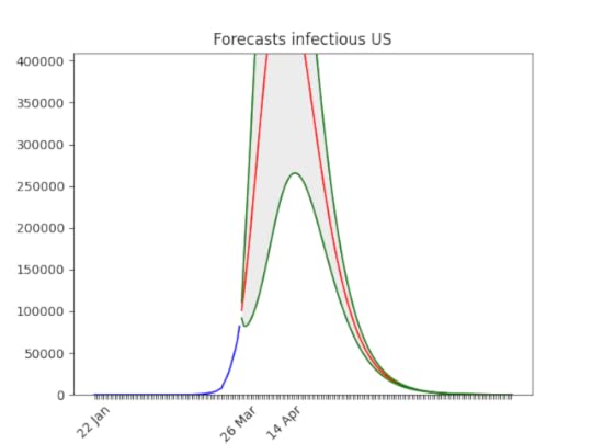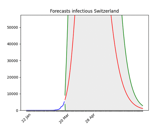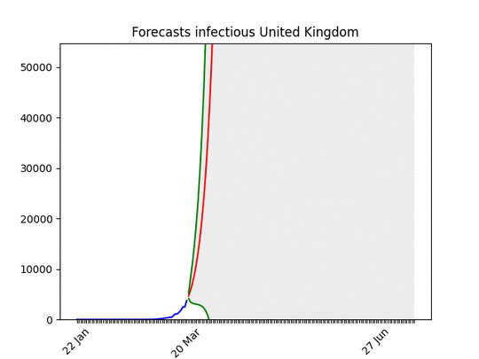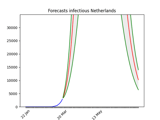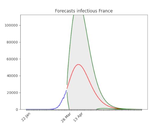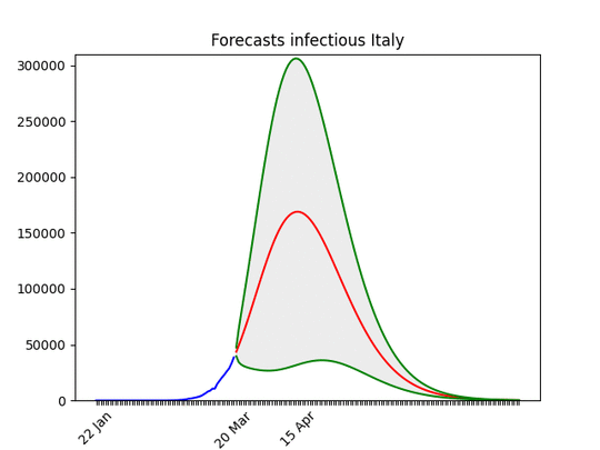The algorithm initially forecasts a huge amount of infectious people, but as lock-down policies are put in place, the forecasts become more optimistic.