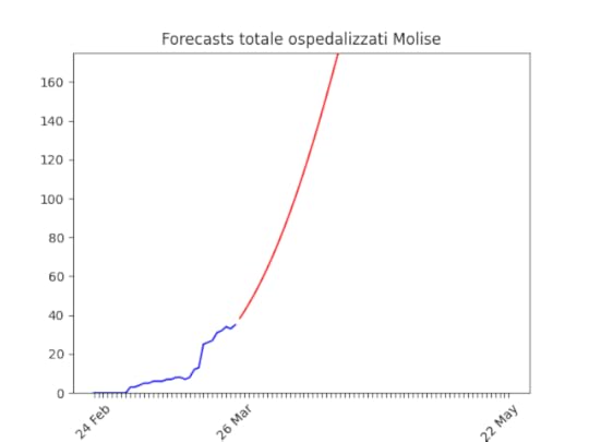 Piemonte, Toscana, Abruzzo, Campania, Sicilia: hanno un trend di crescita intorno al 20% che non accenna a diminuire.Valle d’Aosta, Umbria: come sopra, ma una statistica abbastanza bassa, per cui la stima può cambiare in fretta.Lazio: si inizia a vedere una diminuzione del trend, ma ancora troppo piccola.Molise: è passata da 7 a 19 ospedalizzati. Con un numero (per fortuna) così basso un salto simile non può essere considerato come significativo.Basilicata: ha un numero di ricoverati bassissimo (oggi 8).Differenze rispetto ai giorni passati: ho “smussato” i dati, per non essere troppo sensibile alle fluttuazioni giornaliere (per esempio un giorno ci sono stati pochi ricoveri per un qualsiasi motivo, e quindi il giorno dopo c’è un incremento superiore alle attese).