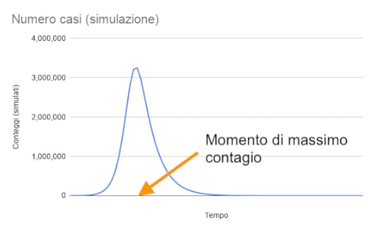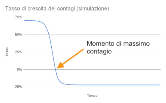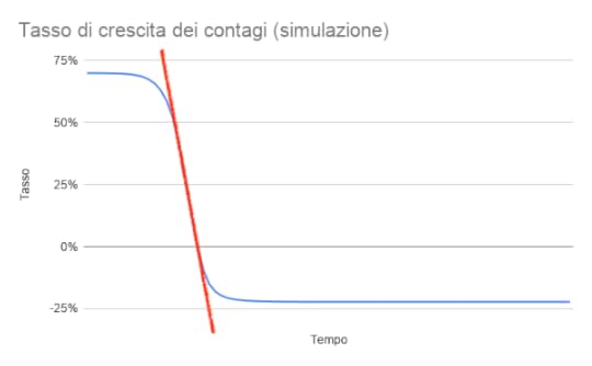 It starts with a growth of 70%. Then the growth rate decreases until it reaches zero (“Momento di massimo contagio”, ie the maximum of the previous curve is reached). Then it becomes negative, i.e. the number of infected people decreases, until it decreases with an exponential rate of 20%.