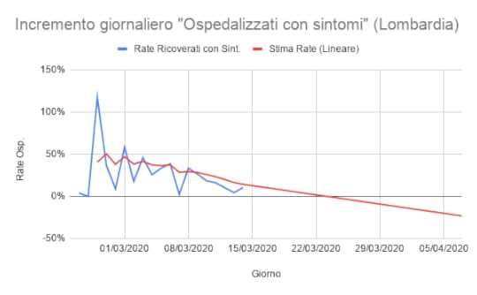 The growth rate of hospitalised people with COVID symptoms in Lombardy. The rate is diminishing.The estimated trend of hospitalizations that resulted (in red) with the data available on March 15 was this: