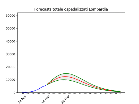 Il modello sembra funzionare. Nel post originale avevo previsto per la Lombardia un picco tra 10 e 13.000 ricoverati a fine mese. Siamo a 12.471 (dati del 28 marzo della Protezione Civile), e in basso la situazione oggi.