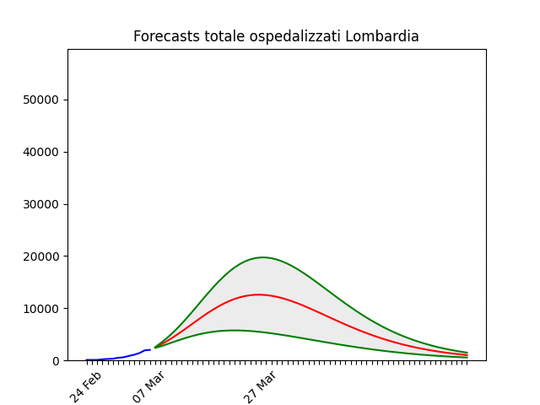 Intorno al 10 marzo il numero di ospedalizzati previsto crolla fortemente. Dopo il 18 marzo sembra molto probabile che il picco non si alzerà più di tanto. NB che l’aumento di nuovi casi di oggi sembra essere dovuto (a guardare i dati della Protezione Civile) ad un aumento del numero di tamponi. Il rapporto “casi confermati/tamponi eseguiti” in Lombardia resta costante intorno al 39%.