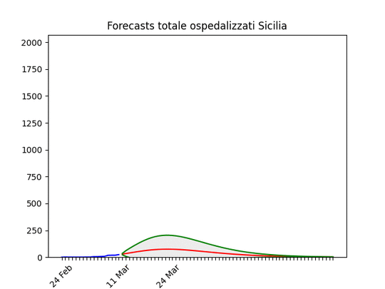 Approximating a SIR model (Susceptible–Infectious–Recovered), whose full implementation can be found here on Google Docs, I made a forecasts of the hospitalised people in all Italian regions from today onwards. Data and figures are updated every day. Note that the Italian Civil Protection made all data available on GitHub. Unlike similar entities in other countries. Note also that the number of hospitalised people is what we are really interested in. The problem about COVID-19 is that we risk the collapse of the health system because too many people in needs of Intensive Care.
