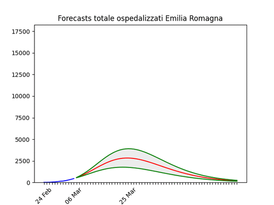 Dopo un buon inizio le previsioni per l’Emilia Romagna aumentano intorno al 15 marzo. Al momento è previsto un picco tra 5 e 7.000 ricoverati la seconda settimana di aprile.