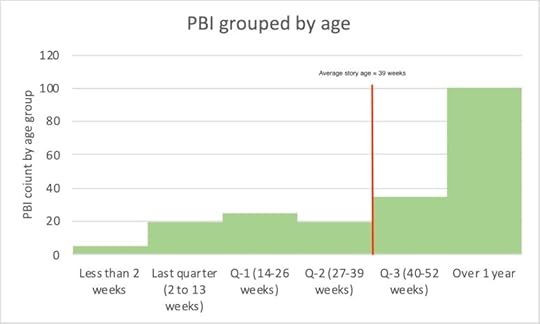 Thats a useful metric, I think we can do better, look at the graphic above. I group backlog items into age groups and graphed them. For completeness I added a line to indicate average story age. Clearly this backlog is not fresh – nearly half the stories are over a year old.