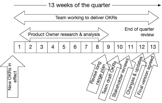 Typically the OKR cycle is 13 weeks long which immediate begs the question of how it fits with 2-week sprints? I was already moving towards saying “aim for 12 or 14 weeks” but after listening to a number of podcasts and talking to others I increasingly think 13 weeks is not the best period.