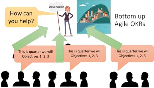 So, if we are to use OKRs in an agile environment these positions need to be reconciled. In Succeeding with OKRs I described the process as more bottom-up than top-down. Thus, rather than a big boss saying what should happen and that being cascaded down the origanization to provide goals at every level, I describer the big boss setting out a vision, a goal, an objective but not describing details. Then they say to the teams: “Help, how can you help more us towards that goal?”