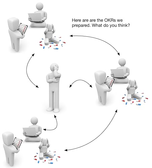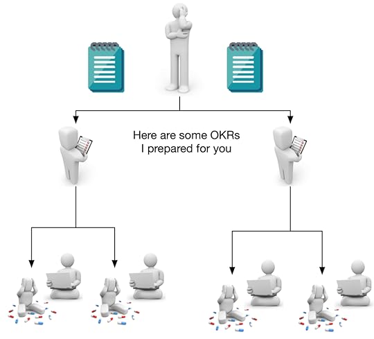 Pull don’t pushThose of you versed in the benefits of pull systems over push systems might like toes this argument in pull-push terms. In the top down approach each manager, node, pushes OKRs to the nodes below them. As with push manufacturing the receivers have little say in what comes their way, they do their bit and push to the next in lucky recipient in the chain.