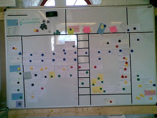 Ever seen a Kanban board with 26 columns, or was is 22? I can’t remember. Half of them were queues anyway. (And here is a video of the full board.) How does a board get so big? Well…