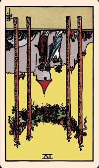 When the Four of Wands appears reversed, the turret on the castle forms an arrow that is pointing downward. It is time to get back in touch with the earth and with a sense of reestablished stability. It may also be time to build a new foundation, especially concerning the company you keep. Try to detach from drama.