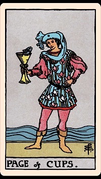 When the Page of Cups appears, tune out the inner critic that all too often whispers in your ear. Do something expressive just for the joy of it. Make your house more vibrant and colorful. Do something crafty, make something, play, spend some time teasing a big baby (especially a grown up one).