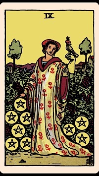 The Nine of Pentacles represents wealth, security and savoring your success.Every financial guru teaches that gratitude for what you have leads to even more wealth. The Nine of Pentacles teaches that wealth follows your focus (which must be trained) and is more of a state of mind than a dollar amount. If you want to experience even more wealth, you will have to slow down, acknowledge your success, and train your focus.