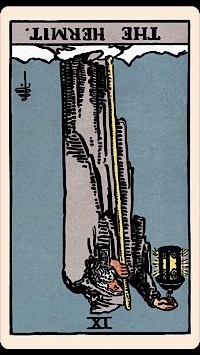 When the Hermit appears reversed, it indicates that it is time to reemerge from your inner landscape and share yourself with the outside world again.After a period of introspection and self-work you have gained new insights and wisdom. Now the demands of the external world may be calling you back. Duties will multiply, and events may pick up speed. The Hermit is the "way-shower" from within. Don't be surprised is you may be a way-shower to others, now that you made your own journey. It is time to engage with the world around you and share your unique wisdom and experiences.