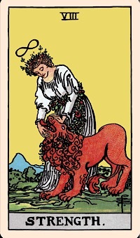 The Strength card is a symbol of inner fortitude, which helps us prevail in the face of life's challenges. Strength is something that needs to be reinforced every day. Just as muscles need to be continuously used to maintain their power, so too does inner strength need to be exercised. Every time you act in your own best interest despite your fears and inner weaknesses, you are developing strength. Strength is a choice. You can either buckle to what keeps you stuck and afraid, or you can choose excellence.