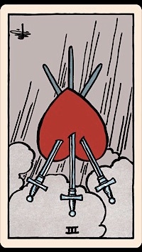 The heart on the card is the victim of devastating injury. Three large swords symbolize wounds inflicted by three past traumatic events. The swords are weighing the heart down beneath grey clouds. Rain continuously pelts down on the sunken heart. And yet look at the proportions... The floating heart is quite large when compared to the swords. This symbolizes that the heart is stronger and more resilient than any wound to it. It also symbolizes that the wounds can weigh down a normally buoyant heart. This negative energy prevents the heart from rising above the clouds, to bask in joyful sunlight.