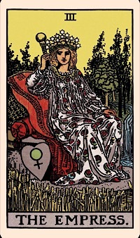 The Empress makes all things grow with the power of gentle patience and love. This loving force is always busy at work. It can be seen in our major life events and rites of passage. The Empress is also busy in the background of our lives, making the trees blossom, grass grow, and the generations to pass on their torches. Her loving energy is present when a mother holds her baby for the first time, and also when a man calls for his mother when he is about to pass on. The Empress reminds you of the power of your highest ideals. This energy allows you to manifest whatever dream you are trying to create. When the Empress arrives she unburdens you of worries because she places issues in the context of the "big picture." The Empress reminds you that all that really matters is love. This is why you can believe her when she whispers "Everything is going to be okay."