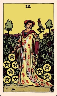 The Nine of Pentacles represents wealth and security. It also symbolizes savoring your success. Every financial guru teaches that gratitude for what you have leads to even more wealth. The Nine of Pentacles teaches that wealth follows your focus (which must be trained), and is more of a state of mind than a dollar amount. If you want to experience even more wealth, you will have to slow down, acknowledge your success, and train your focus.