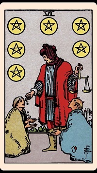 The Six of Pentacles represents compassion, generosity, and hospitality. It is a card that depicts good deeds and the concept of good karma. This card reminds you that the true quality of a person is not measured by how much they impress the powerful and influential people of society. Instead, it is measured by how they treat the people who they stand nothing to gain from. When you show kindness and generosity to those who you would probably gain “nothing” from, you may find that you walk away with a gift far greater.