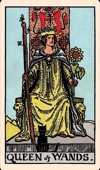 The Queen of Wands had to learn to be comfortable with herself. By fully loving and accepting herself, she becomes open to the possibility of being loved by others for her true self. She actually takes the risk to smile and reach out to others before they greet her. She shows her subjects that she can see their light clearly, because she went through the process of discovering her own. The Queen of Wands never brags about her accomplishments, she lets her life's results speak for themselves. What you see is what you get. She also know that the truest path toward suffering is to compare herself to others. She shines brightly without caring if she looks stupid or if some of her relatives in the pentacles suite think she's impractical or even crazy.