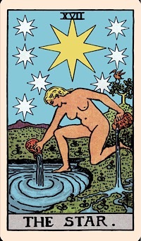 The Major Arcana in the Tarot can be interpreted as a path laid out in symbols toward deeper understanding of the self. In the Major Arcana, the Star is numbered XVII, and occurs immediately after the most challenging cards (XII The Hanged Man, XIII Death, XV The Devil, XVI The Tower). After accepting sacrifice, death, confronting the shadow self, and returning to her true nature, the superficial layers of the ego are stripped away. The Star represents the imperishable light within you that transcends the fears of the ego. This is the eternal starlight of Spirit. Each of us possesses this light. This light is always sparkling within us. However, sometimes it is so buried beneath burdens, and layers of ego and fear, that it is hard to feel or see. Some people forget this light exists altogether, until they see a laughing baby, or are moved by a pivotal (sometimes traumatic) life event. The Star card reminds us that our inner light exists. When we draw from its eternal waters, we can bounce back from death and defeat, transcending all challenges. Knowing this, we come to understand there is really nothing to fear...
