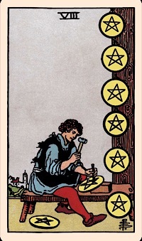 The craftsman on the card busily inscribes his Pentacles with a hammer and chisel. He loves his work. It gives him a channel to focus all of his creative energy. A pathway connects his workshop to the little village in the distance. This symbolizes that his work connects him with others. To the townspeople he is not just "the Craftsman." He is also the master of eight apprentices, the beloved teacher at the monastery, and has gained the town's affection for his compassion and kindness. The craftsman is also very funny; bringing laughter to the villagers, with his dry wit and humor. The craftsman doesn't just do work for the village to "make money." Each day he uses work as a vehicle, to improve his community, connect with others, and better himself.