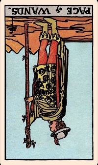 When the Page of Wands appears reversed he signifies that you must be present and patient with your when cultivating your talents. The Page of Wands is crackling with creativity. He is a fiery character whose mind can often be found thirty steps ahead of his present location. When this Page appears reversed he reminds you to slow down and enjoy being present with what you are learning. He might also indicate that you need to take a more methodical approach to achieving your goals. Don't let your mind race and wander without discipline. You have tremendous talent and creative energy available to you to manifest whatever you want in life but it needs to be applied thoughtfully.