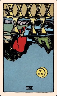 The Eight of Cups represents taking the journey within, to the realm of your authentic feelings. Periodically you must go deep within yourself, to hear your Spirit, and reclaim strengths and abilities you forgot you possessed. Although the journey inward is of great value, it rarely feels easy to begin embarking on it. It is often accompanied by a period of depression, feeling crazy, or the sense that you've hit a patch of “bad luck." The Eight of Cups reminds you that you've probably made a similar journey before, just prior to a deeper revelation about yourself. Your instincts will once again, be your best guide.