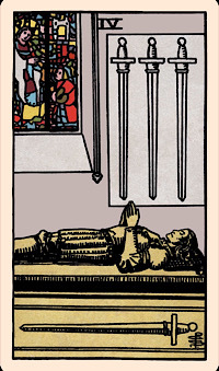 The Four of Swords symbolizes our need for inner-peace. It encourages rest and recuperation. The appearance of the Four of Swords gently reminds you to call your attention to your body, and any areas where tension has been building up. You may need to give yourself some peace and quiet to rejuvenate your body, mind, and spirit. You could also find that it's time to let go of whatever is preventing a sense of peace and causing inner-suffering.