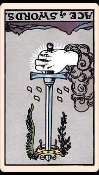 When the Ace of Swords appears reversed it represents defending positive new ways of thinking that are still in their infancy. When the blade of a sword is depicted upright, it symbolizes that it is “at the ready.” When a sword is upraised it is ready to fight or to act. An upraised sword can respond to any anticipated action. When a sword is depicted with its blade lowered (as in this case) it symbolizes that the sword is in a state of peace, rest, and that it is guarding something.