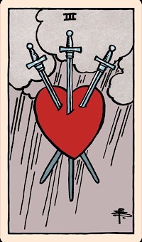 The heart on the card is the victim of devastating injury. Three large swords symbolizing the wounds inflicted by three traumatic past events. The swords are weighting the heart down beneath grey clouds. Rain continuously pelts down on it. And yet look at the proportions... The floating heart is actually quite large when compared to the swords. This symbolizes that the heart is stronger and more resilient than any wound to it. It also symbolizes that the wounds (swords) can weight the floating heart down. This negative energy prevents it from rising above the clouds to bask in joyful sunlight.