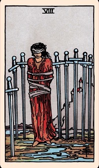 The Eight of Swords illustrates the kind of fear that blinds us, causing us to not see the present. It paralyzes us as we wait for "bad things" to come to pass. The Eight of Swords symbolizes fear that relies on past evidence to validate it. Something traumatic happened to the woman in the card. She was blindfolded, bound up, and abandoned. The people who brought her to this place are gone. Her fear that she is worthless has convinced her that all that remains is to wait for the tide to come, and swallow her whole. She has been "shunned."