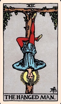 The Hanged Man is suspended from the branches of the Tree of Wisdom. He is seeking to improve himself. By hanging upside down, he is gaining a new perspective, and he looks at the world from a different vantage point. All the blood rushes to his head. All his energy is being pooled into his mind. He is temporarily sacrificing the use of his legs and arms. This represents sacrificing the desire to walk away. The Hanged Man is suspending his normal routines, to focus his energy. His face is calm. Although he is not "comfortable," he is not suffering. He knows that sacrificing his usual stance of keeping his feet firmly on the ground will free his mind to new solutions.